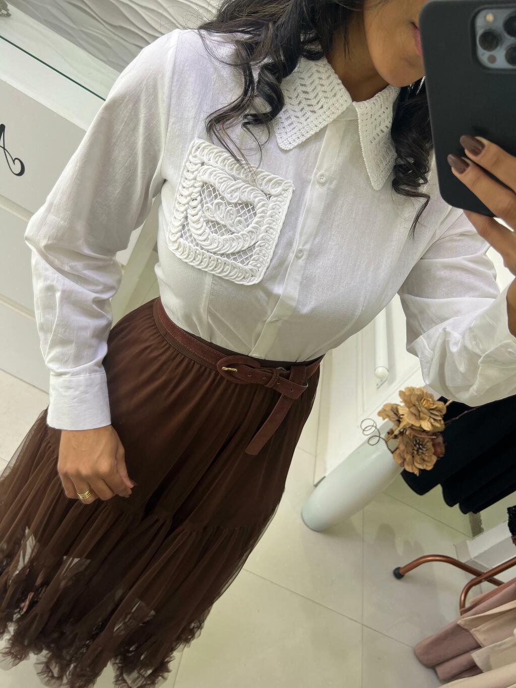 Possui gola e bolsos bordados em tecido ,com botões funcionais frontal e no punho ,Tecido linho .